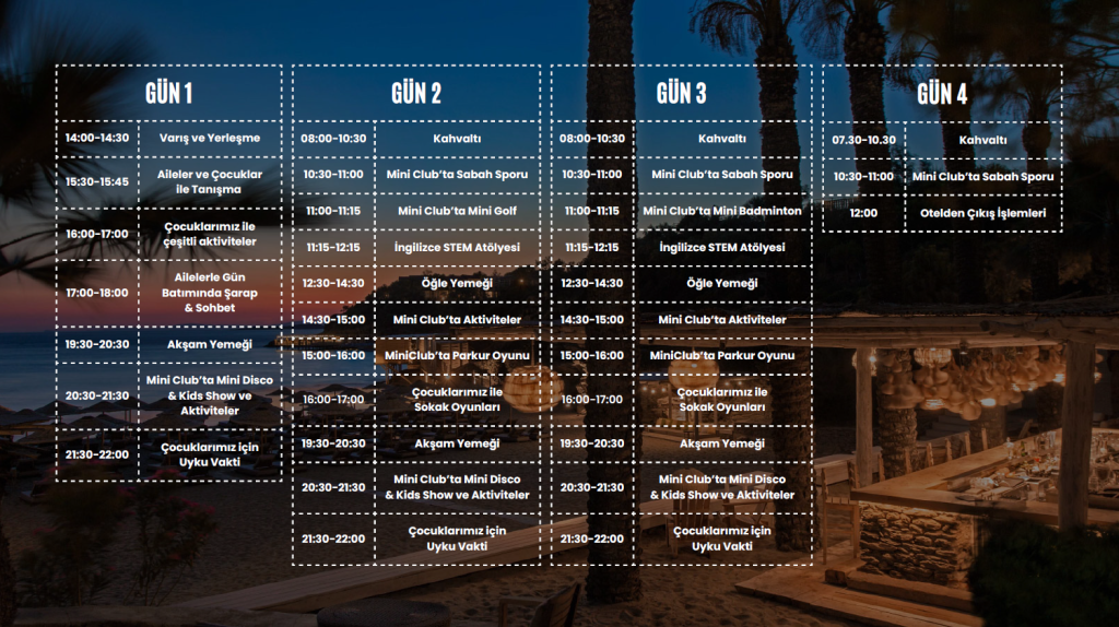 We will have an unforgettable camp experience with fun and educational workshops in Turkish and English, special outdoor sports activities and many more surprises for children.